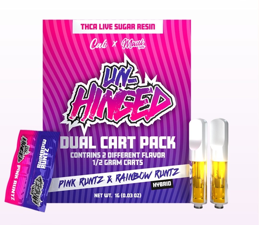 The Cali x Maui labs Unhinged Disposable lineup expands with a bold hybrid fusion: the Pink Runtz + Rainbow Runtz Dual Cart – Unhinged. This premium dual-cartridge system blends two beloved Runtz profiles into one powerful hybrid experience. It delivers rich candy sweetness, vibrant fruit notes, and dense clouds backed by potent THCA performance. For vape lovers who expect strength, flavor, and convenience, this dual cart stands out as one of the most elevated offerings in the Unhinged series.
